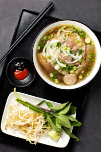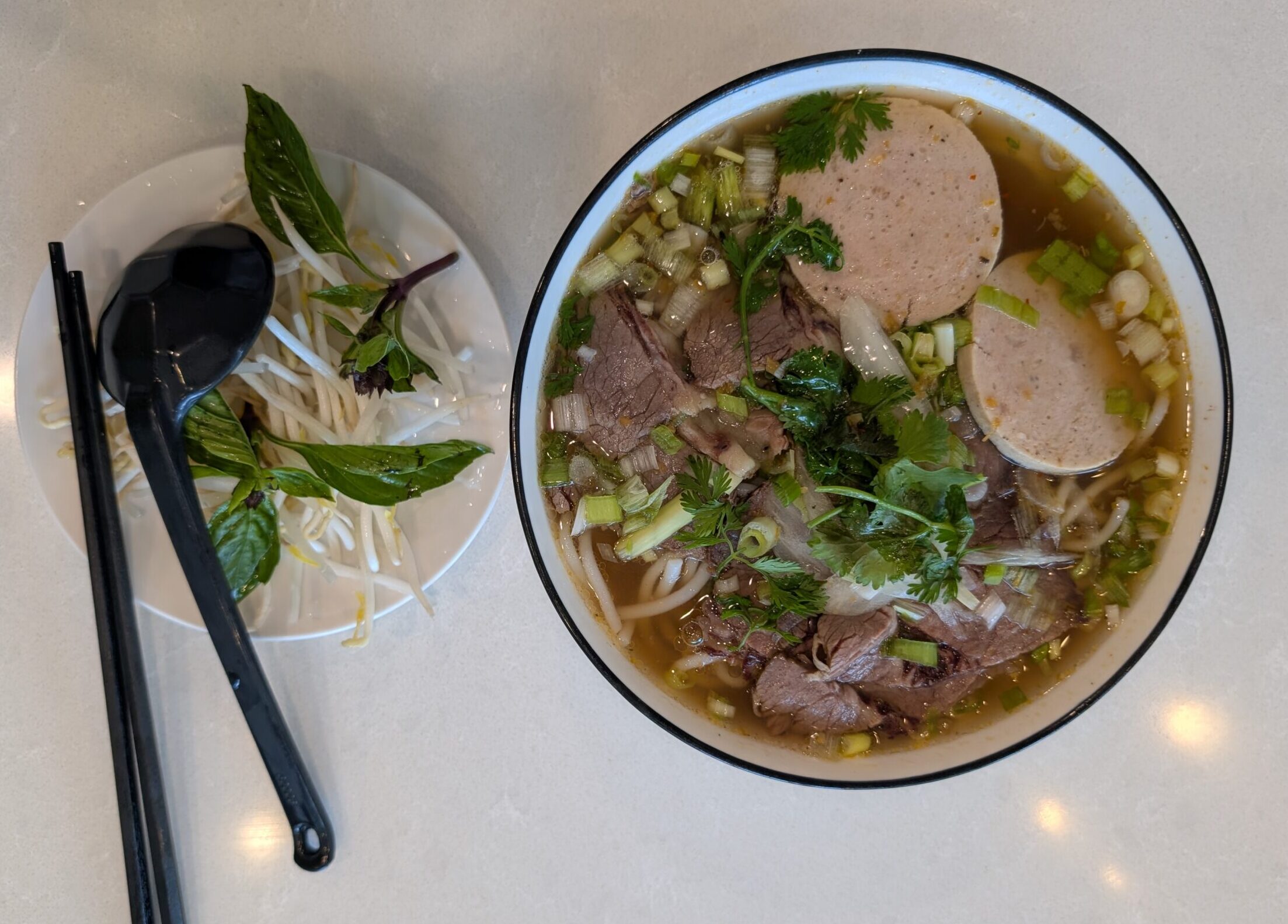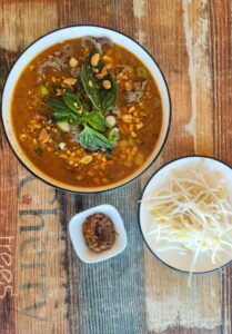 (Sliced beef brisket, sliced pork hock, Vietnamese ham, thick round rice noodles, spicy pork broth served with onion, bean sprouts, & basil)