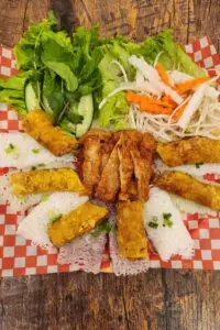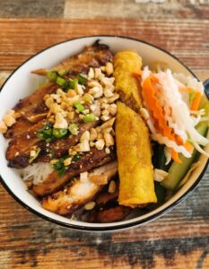 Savour the taste of grilled pork patties with a crispy spring roll, tender vermicelli noodles, pickled carrots, fresh herbs, lettuce, cucumber, roasted peanuts, and a delicious mixed fish sauce. (Gluten-free).