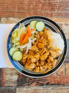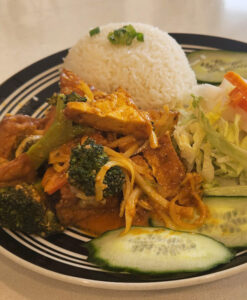 Stir-fried chicken with house-made peanut sauce is served on steamed rice or vermicelli alongside refreshing lettuce, crunchy cucumber slices, and pickled carrots.
