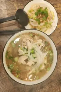 Chicken, rice noodles, and chicken broth served with onions, bean sprouts, and basil.